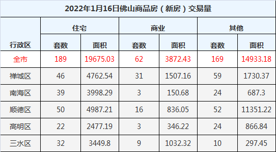 1月16日,佛山一手住宅成交189套,成交面积19675.03㎡