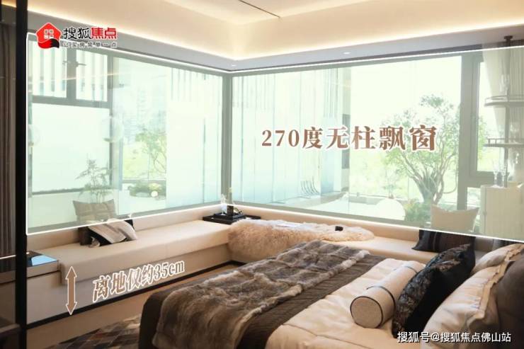 在此基础上,项目飘窗还有两大特色:其一,飘窗台与地面仅离约35cm;其二,主卧均配有270度无柱飘窗。