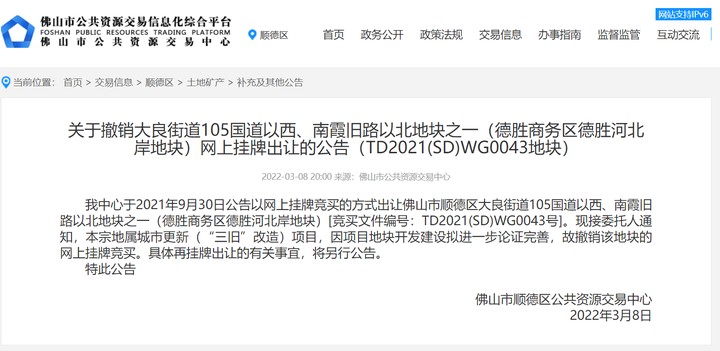 原定于3月10日10时开拍的大良德胜河北岸地块,近日发公告表示,本宗地属城市更新(“三旧”改造)项目,因项目地块开发建设拟进一步论证完善,故撤销该地块的网上挂牌竞买。