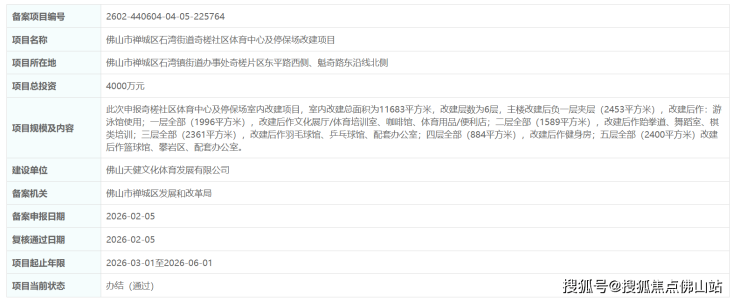 近日,佛山市禅城区石湾街道奇槎社区体育中心及停保场改建项目正式通过备案。