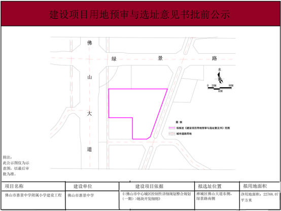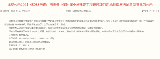近日,佛山市自然资源局禅城分局发布了《禅规公示2021-4S085号佛山市惠景中学附属小学建设工程建设项目用地预审与选址意见书批前公示》,这意味着佛山市惠景中学附属小学选址正式确定。