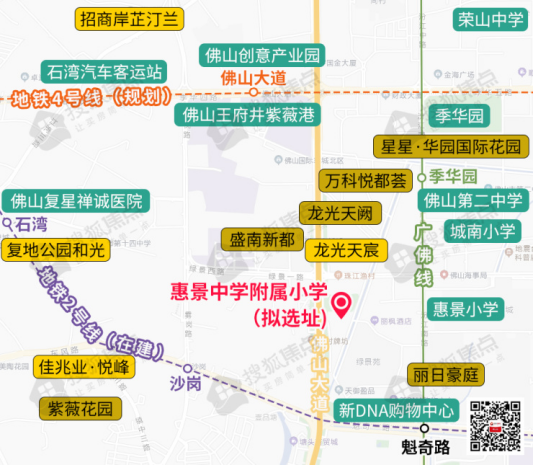 从地图来看,惠景中学附属小学选址属城南板块,有两个临近地铁站,分别是广佛线季华园、魁奇路地铁站,周边楼盘有龙光天宸、盛南新都、龙光天阙、万科悦都荟、丽日豪庭等。