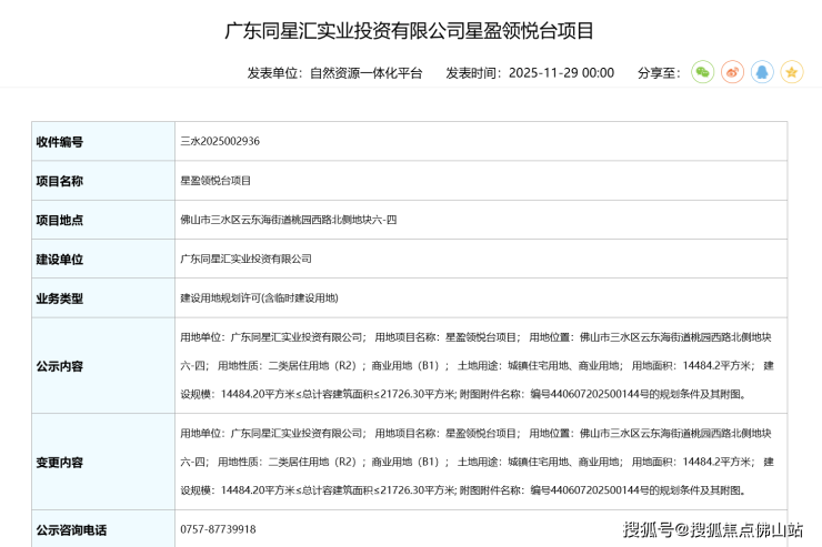 近日,佛山市自然资源局三水分局发布广东同星汇实业投资有限公司星盈领悦台项目。
