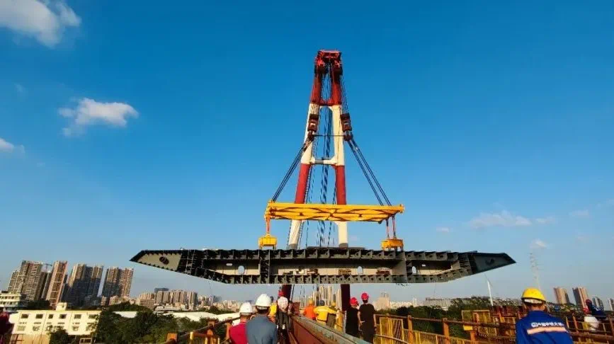 10月11日,伴随着大型船吊的汽笛声和轰鸣声,凤翔大桥正式开始主桥钢箱梁的吊装作业,同时主桥主塔顺利完成了第20节塔段施工,总高度151m的主塔累计完成67%,再一次刷新项目进展新篇章,标志着主桥主塔作业正式进入最后的关键攻坚阶段。