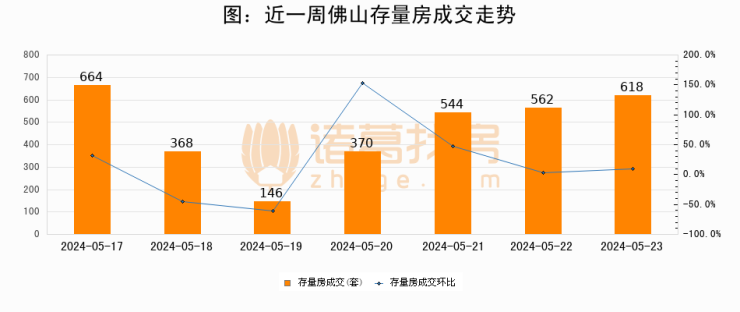 从存量房来看,2024年05月23日佛山存量房单日成交618套,比昨日增加56套,环比上涨10%。从近一周存量房成交来看,佛山存量房日均成交套数为467套,05月23日单日成交618套,高于近一周平均水平32.3%。