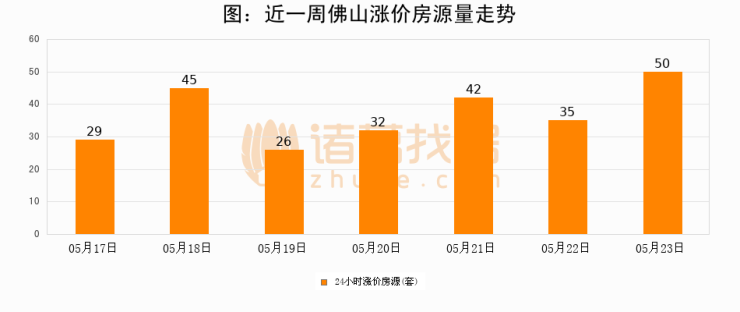 根据诸葛找房数据显示,佛山24小时涨价房源量为50套,较05月22日增加15套,环比上涨42.9%。与此同时,涨价房源占比小幅扩大,业主信心有所提升。