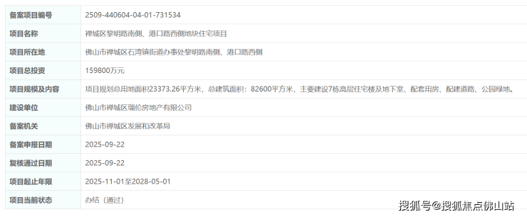 广东省投资项目在线审批监管平台显示,禅城区黎明路南侧、港口路西侧地块住宅项目通过备案。
