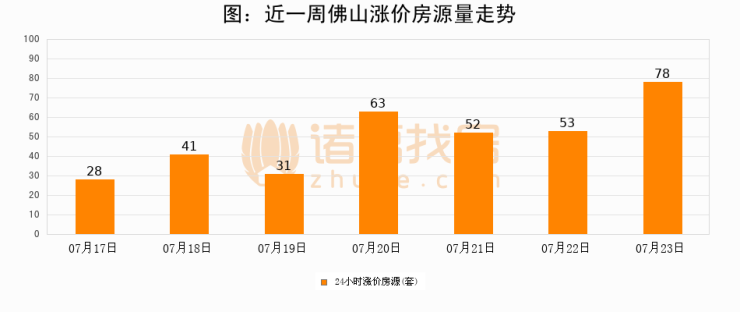 根据诸葛找房数据显示,佛山24小时涨价房源量为78套,较07月22日增加25套,环比上涨47.2%。与此同时,涨价房源占比小幅扩大,业主信心有所提升。