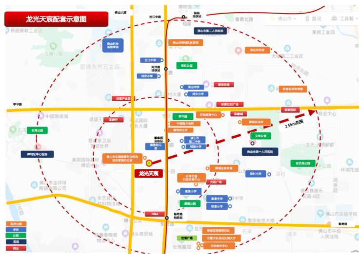 作为禅芯少有在售的百亩大城,龙光天宸享有得天独厚的地段:位处“佛山经济命脉”季华路CBD之上,周边汇集市政府、财政大厦等30多家重要市政机构; 10大商业体环绕,王府井一路之隔;距离广佛线季华园站仅约450米,有2号线在建中,4号线规划中,建成后3地铁环绕;更有叶脉公园、亚艺公园等近100万㎡公园景观资源。