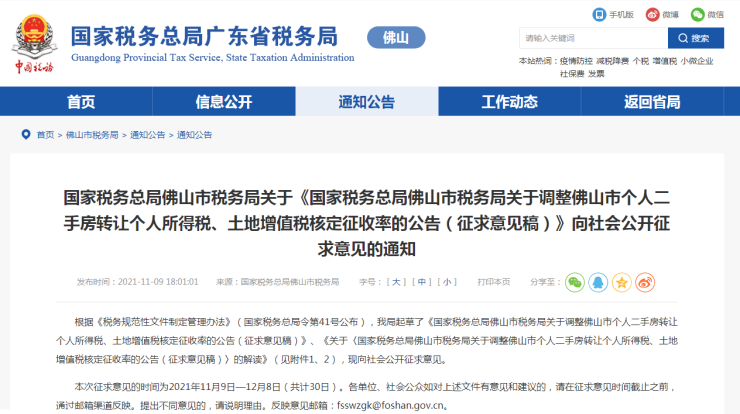 11月12日,佛山二手住宅个税拟从2%降为1%!12月10日起执行!