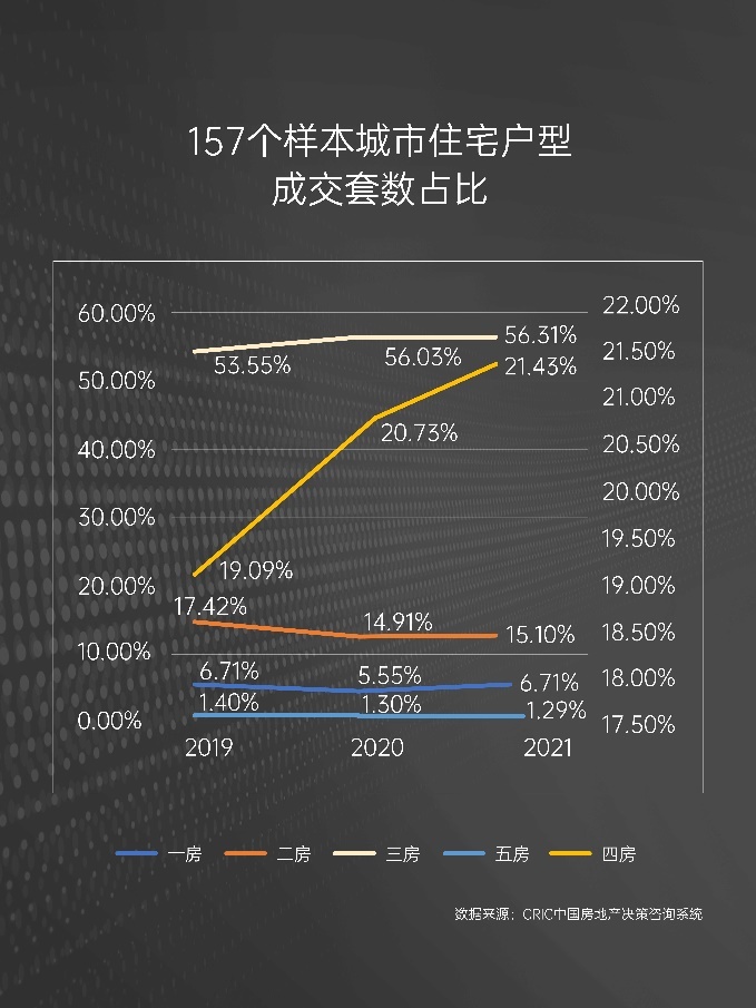 2021年上半年,改善性需求持续释放,157个重点监测城市普通商品住宅成交数据显示,三房成交占比达56.31%,较2020年仅增长0.28个PTS,而四房成交比重持续提升,较2020年增长0.61个PTS至21.34%,虽然短期内仍以三房占主要比例,但四房成交占比迅猛增速,已经释放了明显的信号:楼市迎来变局,四房晋级时代主流。