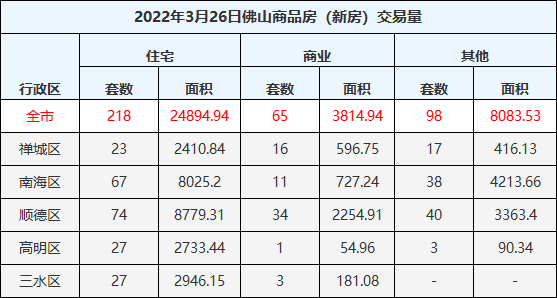 3月26日,佛山一手住宅成交218套,成交面积24894.94㎡