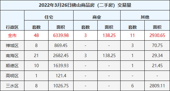 二手住宅成交48套,成交面积6339.98㎡,禅城8套,南海区21套,顺德区10套,高明区1套,三水区8套。