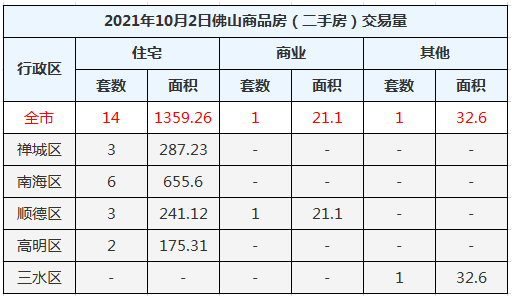二手住宅成交14套,成交面积1359.26㎡,其中禅城3套,南海6套,顺德区3套,高明区2套。