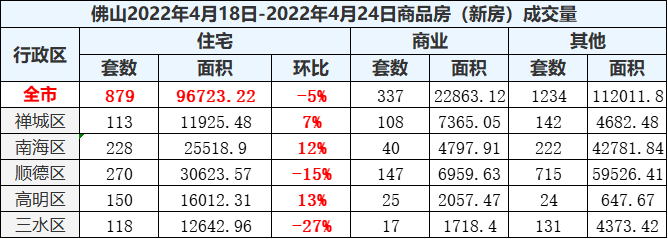 据佛山搜狐焦点统计,上周(2022.4.18-2022.4.24)佛山新房网签数879套,网签面积9.67万㎡,环跌5%。