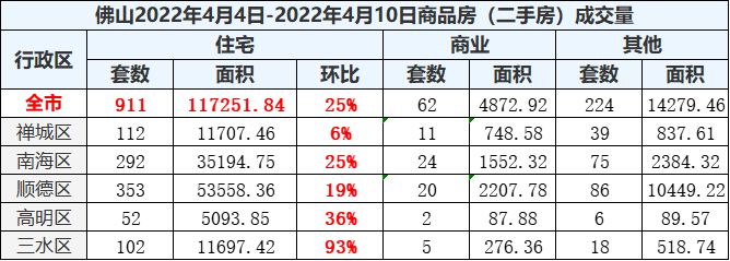 二手房方面,上周佛山二手房网签911套,网签面积11.7万㎡,环比上涨25%。