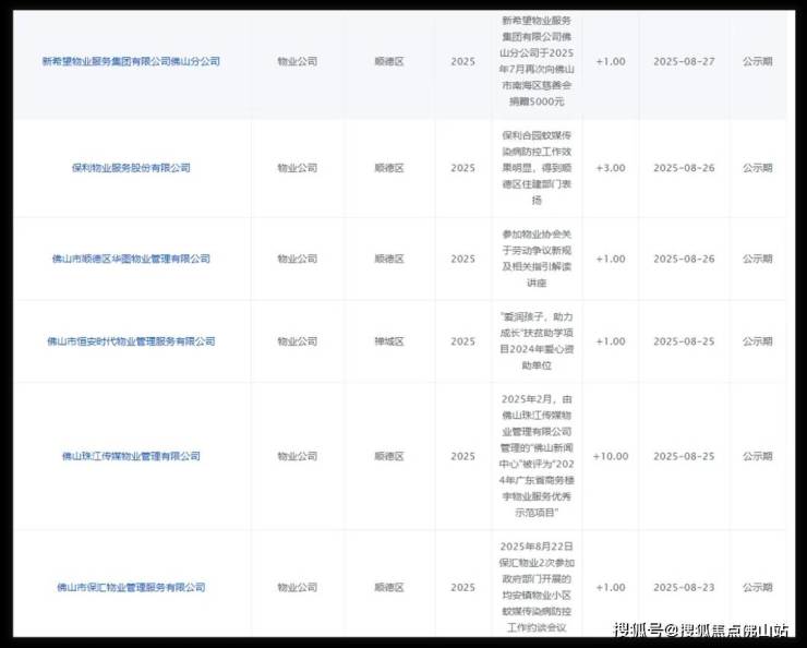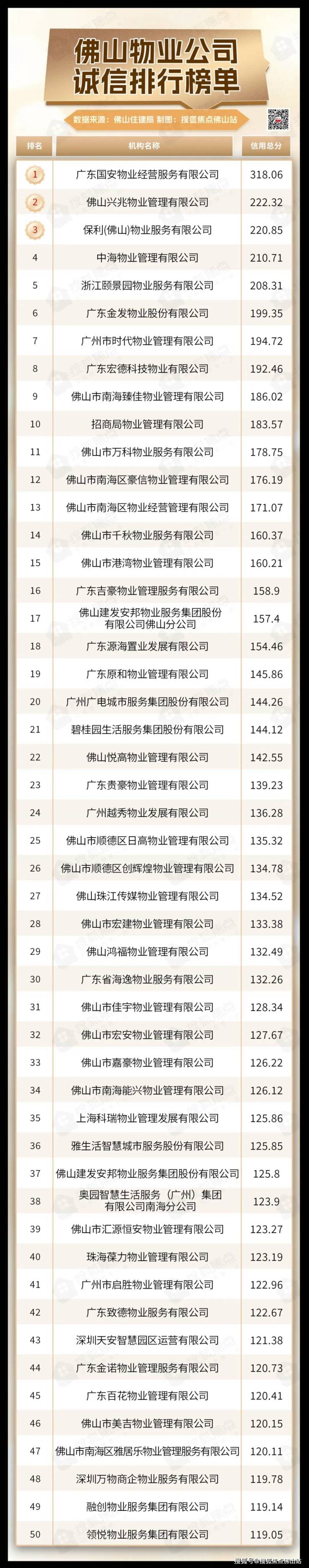 小狐给你们扒来佛山住建平台物业企业排行榜,排名依据是信用总分排名,信用总分评分标准暂未公示,记分年段为2025年。