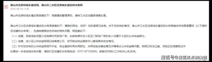 三水区住建局调查显示:目前鸿安花园小区电梯内无张贴广告,此前电梯内以及小区正门张贴的广告收入均属于小区的公共收益部分。