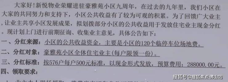 佛山容桂豪雅苑小区,近日将28.8万公共收益盈余以现金形式发放给业主,每户可以领取500元现金。