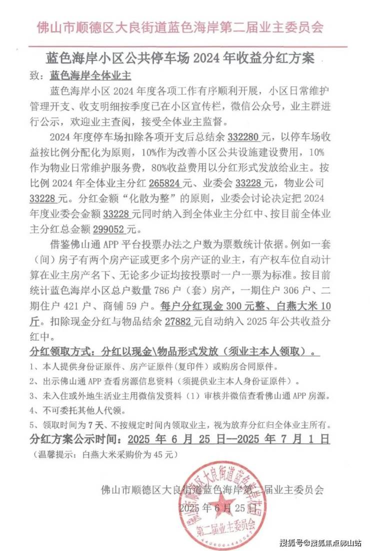 顺德大良蓝色海湾社区,同样每年可以享受公共收益“分红”。