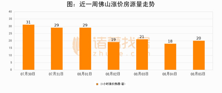 根据诸葛找房数据显示,佛山24小时涨价房源量为20套,较08月04日增加2套,环比上涨11.1%。与此同时,涨价房源占比小幅扩大,业主信心有所提升。