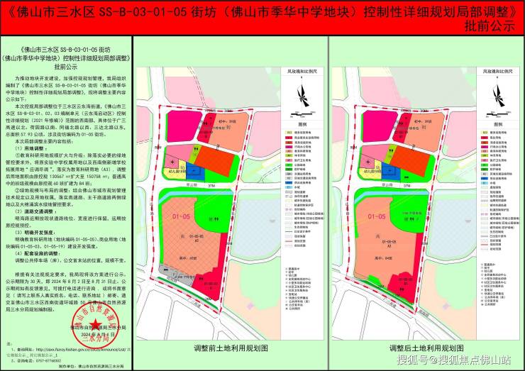 8月2日,市自然资源局三水分局发布了 《佛山市三水区SS-B-03-01-05街坊(佛山市季华中学地块)控制性详细规划局部调整》批前公示。
