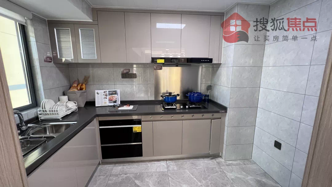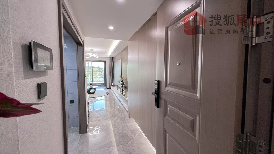 进入样板间,进门左侧是厨房,右侧为一排宽2.8米左右的玄关柜,收纳空间非常大;