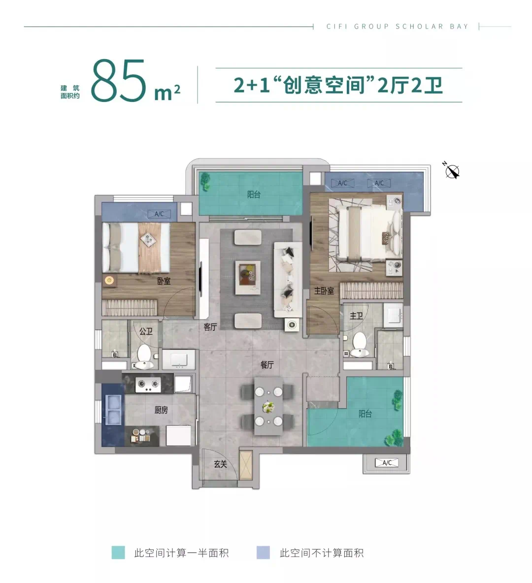 85㎡的这个户型是目前的最小户型,位于3栋的东北侧,景观方面可能会有所欠缺;但是,从户型平面图上来看,格局比较方正,整体的空间利用率很高;