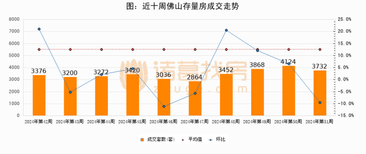 存量房方面,第51周佛山存量房成交3732套,较上周减少392套,环比下降9.5%。从近十周成交走势来看,周均成交套数为3434套,本周高于平均水平8.7%。
