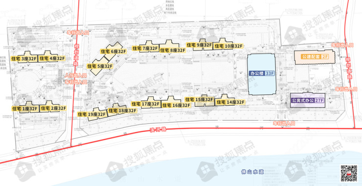 从规划图来看,项目将规划建19栋高层建筑,涵盖住宅、公寓、商办等产品类型,其中1-10座、14-19座均为高层住宅,楼高均为32层。