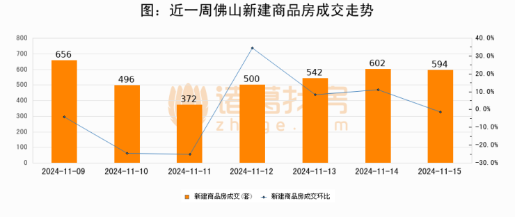 根据佛山市住房保障和房产信息网数据显示,2024年11月15日佛山新建商品房成交594套,较昨日减少8套,环比下降1.3%