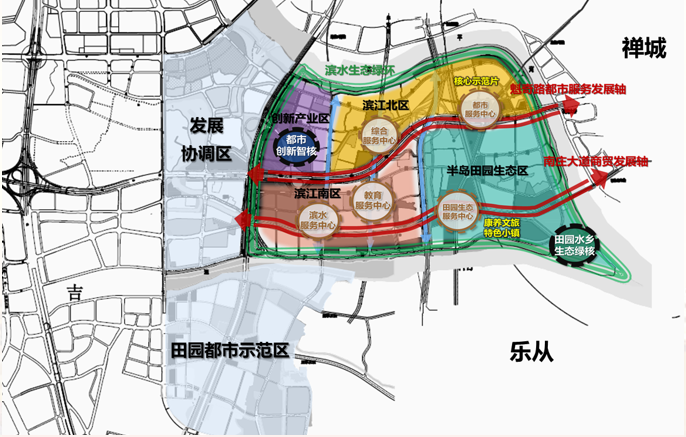 在功能分区上,凤翔湾分为滨江北区、半岛生态田园区、滨江南区、创新产业区;形成都市服务中心、田园生态服务中心、教育服务中心、滨水服务中心、综合服务中心等多个节点,并通过交通主干道及水道串点成线、连片成带。