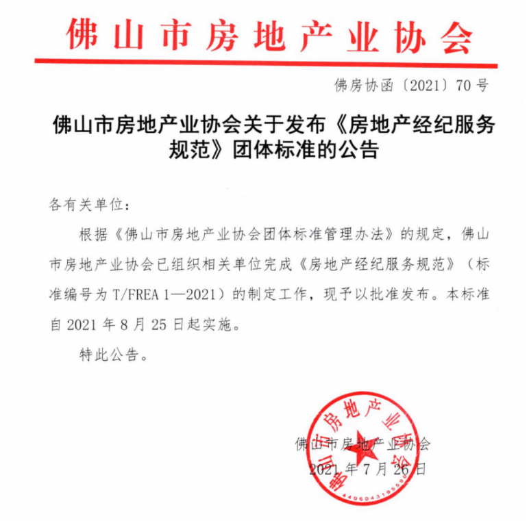 佛山市房地产业协会发布《房地产经纪服务规范》团体标准。