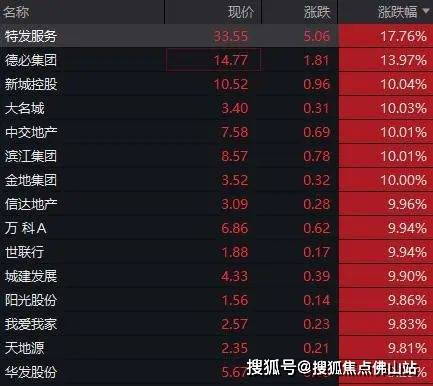万科A、金地集团等多股涨停,世茂集团一度涨逾20%,雅居乐集团、新城发展、华南城等个股录得10%以上涨幅。