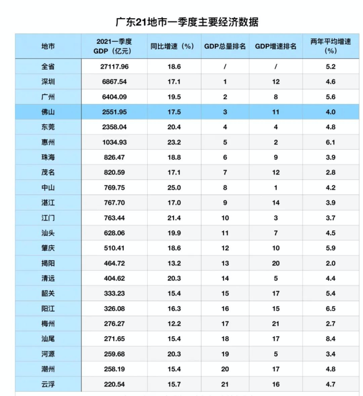 近日,广东及其各地市2021年一季度经济数据公布,佛山位居全省第三,实现地区生产总值(GDP)2551.95亿元。在湾区城市中,仅次于广深,未来还会持续增长。