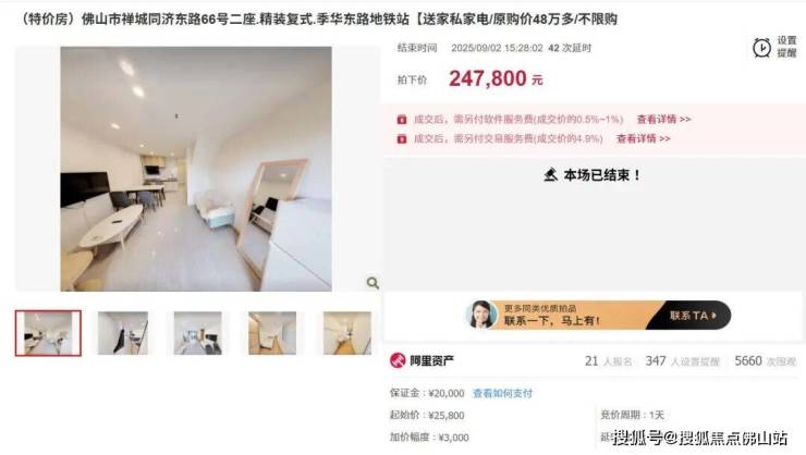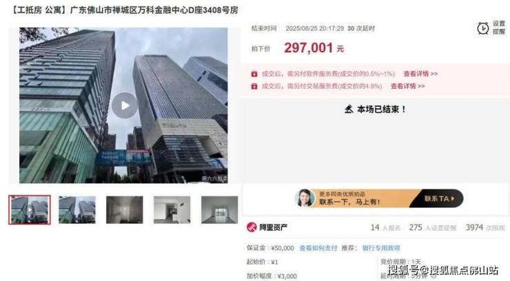 例如万科金融中心的一套建面约47㎡公寓,起拍价为1元,加价幅度为3000元或整倍数,最终以29.7万成交。