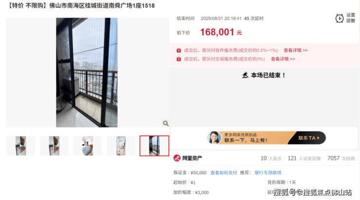 南海南舜广场一套“1元起拍”的房源,被疯抢50轮后,以16.8万成交。