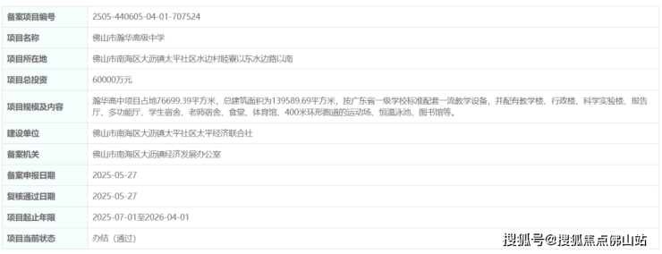 近日,佛山市瀚华高级中学项目正式备案,预计将于7月开工,2026年4月建成。