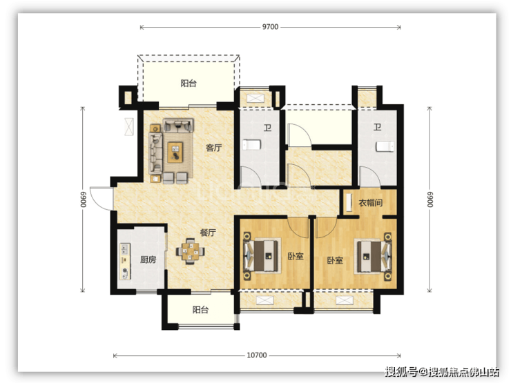 禹洲朗廷湾的三房户型比较方正,其中建面约96㎡三房,拥有南北双阳台。