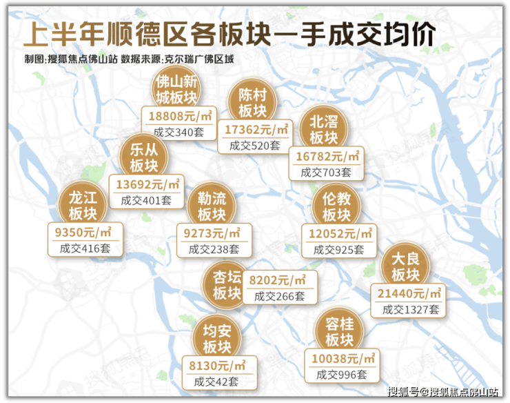 顺德区各板块中,仅有大良成交均价突破2万/㎡,佛山新城紧随其后,成交均价为18808元/㎡。