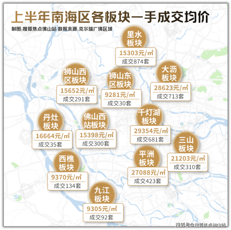 克而瑞广佛区域发布的数据显示,今年上半年,佛山各板块的成交均价在5109-29354元/㎡之间,其中超过2万/㎡的板块有7个,分别为城南、大沥、千灯湖、平洲、三山、大良。
