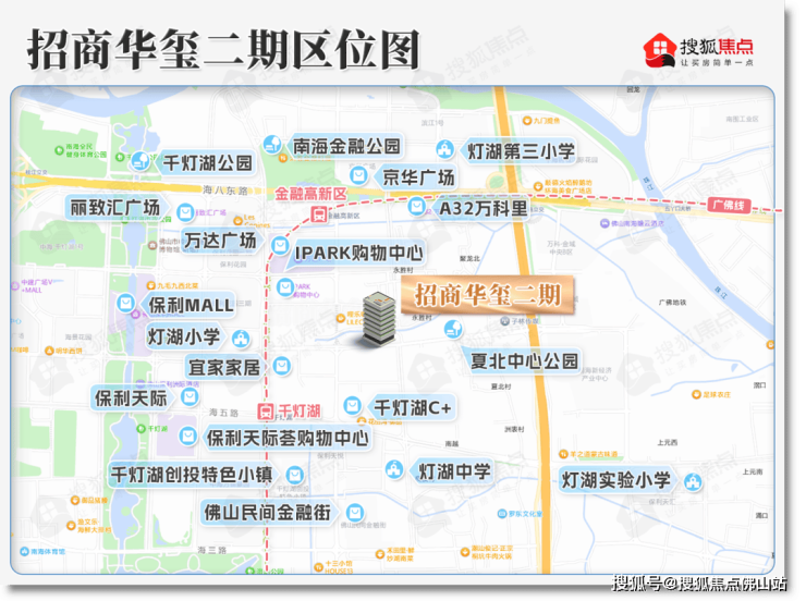 周边有万达广场、寰宇城、宜家家居等大型商业综合体覆盖,毗邻千灯湖公园、南海活水公园,汇聚灯湖小学、南海实验小学、灯湖中学等优质学府。