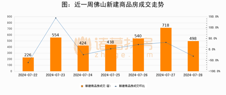 根据佛山市住房保障和房产信息网数据显示,2024年07月28日佛山新建商品房成交498套,较昨日减少220套,环比下降30.6%。近一周佛山新建商品房日均成交486套。07月28日单日成交498套,高于近一周平均水平2.5%。