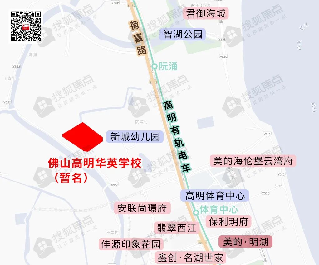 从区位图来看,佛山华英学校项目位属西江新城片区,周边有新城幼儿园、高明体育中心、智湖公园、高明有轨电车等生活交通设施配套。