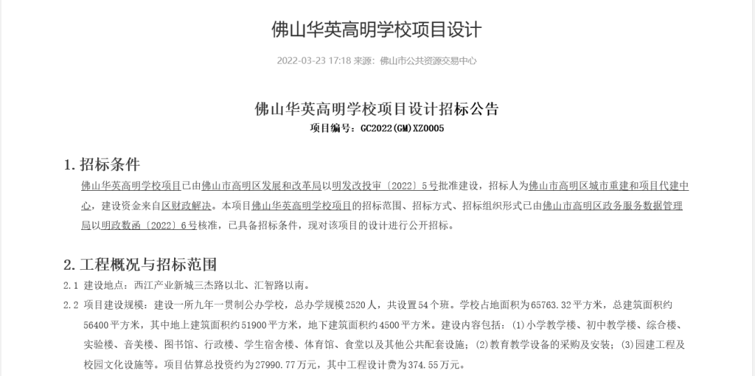 3月23日,搜狐焦点佛山站从佛山市公共资源交易中心获悉,佛山华英高明学校项目设计招标公告正式发布,将于4月13日开标。