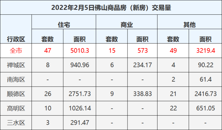 2月5日,佛山一手住宅成交47套,成交面积5010.3㎡