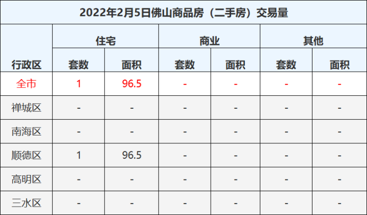 二手住宅成交1套,成交面积96.5㎡,禅城0套,南海区0套,顺德区1套,高明区0套,三水区0套。