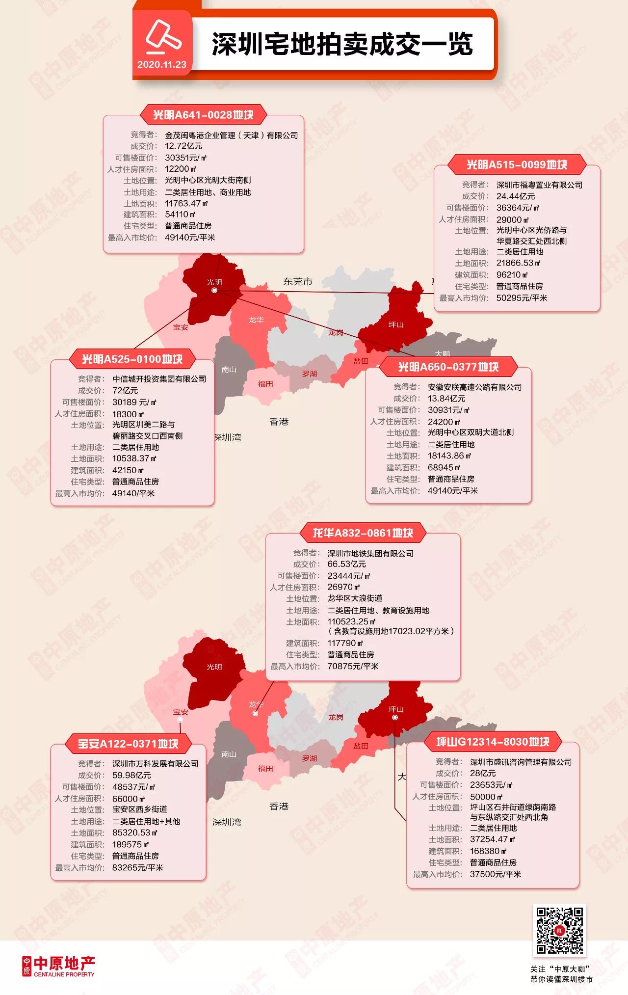 最终,该地块由深圳市地铁集团有限公司以底价66.53亿元竞得,成交楼面价为21409元/平方米。另外,出让信息显示,23日光明区共出让4宗住宅用地,单日收金123亿元。4宗住宅用地中较高销售均价不得高于50295元/平方米。最终,4宗地块由金茂闽粤企业管理(天津)有限公司(金茂)、深圳市福粤置业有限公司(电建)、中信城开投资集团有限公司(中信城开)、安徽安联高速公路有限公司(安徽安联)竞得。位于深圳坪山区G12314-8030地块项目要求,建成后普通商品住房销售均价不得高于37500元/平方米。据悉,坪山区地块共吸引13家房企参与竞拍,包括华发、旭辉、天健、平安、金茂、万科、保利、华润+金地、佳兆业+新城、招商等。