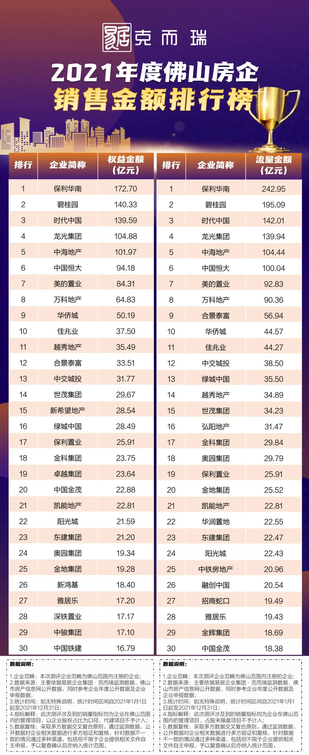 免责说明:克而瑞所发布的“佛山房企榜单”系以易居企业集团·克而瑞监测数据,佛山市房产信息网公开数据为基础,企业年度公开数据及申报信息内容为补充,利用克而瑞第三方测评机构的行业优势和专业立场,通过多维度数据监测、多元化综合评判所生成的房企销售排行榜,为尽可能避免公开数据和监测数据的失真,实现信息核实之目的,对于未自主申报数据的部分企业,视情况不纳入榜单。克而瑞明确表示,上述榜单内容为独立见解仅供参考,克而瑞不对使用上述榜单及其内容所引发的任何直接或间接损失承担责任,且就榜单相关内容享有全部的解释权。
