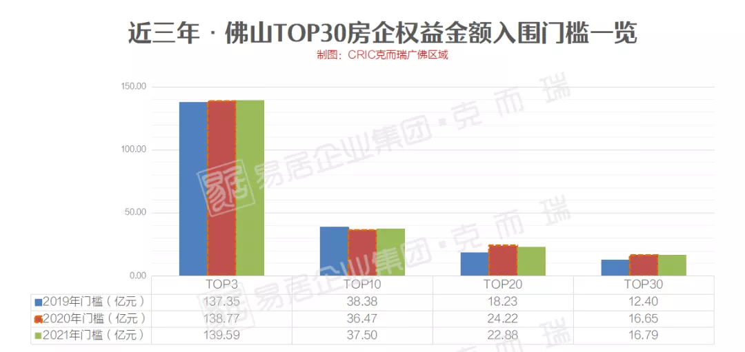 据克而瑞数据统计,2021佛山TOP30房企权益销售规模达1465亿,同比2020下跌了6.4%;